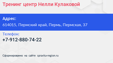 Тренинг-центр Нелли Кулаковой по адресу 614015, Пермский край, Пермь, Пермская, 37 в дальнейшем Организация, размещена в следующих категориях: