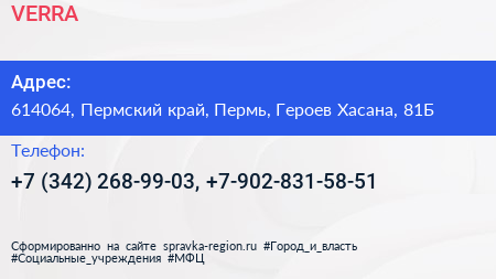 VERRA по адресу 614064, Пермский край, Пермь, Героев Хасана, 81Б в дальнейшем Организация, размещена в следующих категориях: