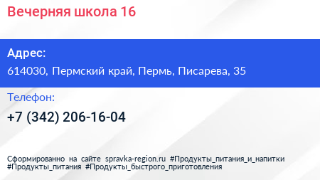 Вечерняя школа №16 по адресу 614030, Пермский край, Пермь, Писарева, 35 в дальнейшем Организация, размещена в следующих категориях: