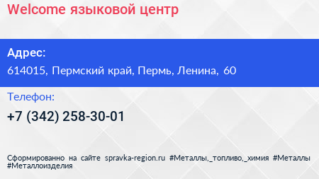 Welcome, языковой центр по адресу 614015, Пермский край, Пермь, Ленина, 60 в дальнейшем Организация, размещена в следующих категориях: