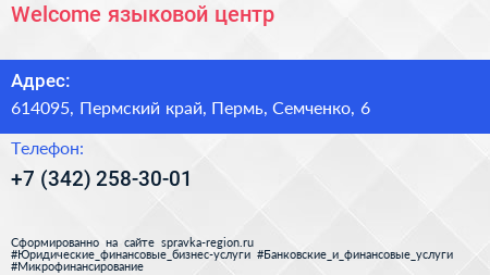 Welcome, языковой центр по адресу 614095, Пермский край, Пермь, Семченко, 6 в дальнейшем Организация, размещена в следующих категориях: