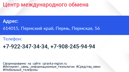 Центр международного обмена по адресу 614015, Пермский край, Пермь, Пермская, 56 в дальнейшем Организация, размещена в следующих категориях: