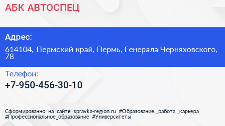 АБК АВТОСПЕЦ по адресу 614104, Пермский край, Пермь, Генерала Черняховского, 78 в дальнейшем Организация, размещена в следующих категориях: