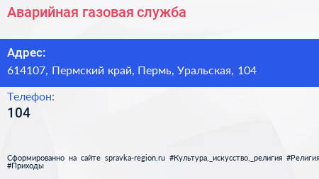 Аварийная газовая служба по адресу 614107, Пермский край, Пермь, Уральская, 104 в дальнейшем Организация, размещена в следующих категориях: