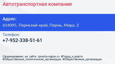 Автотранспортная компания по адресу 614095, Пермский край, Пермь, Мира, 2 в дальнейшем Организация, размещена в следующих категориях: