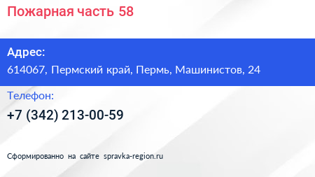 Пожарная часть №58 по адресу 614067, Пермский край, Пермь, Машинистов, 24 в дальнейшем Организация, размещена в следующих категориях: