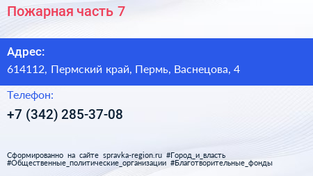 Пожарная часть №7 по адресу 614112, Пермский край, Пермь, Васнецова, 4 в дальнейшем Организация, размещена в следующих категориях: