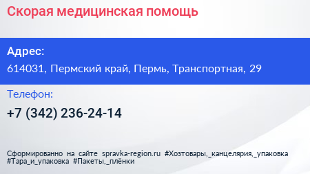 Скорая медицинская помощь по адресу 614031, Пермский край, Пермь, Транспортная, 29 в дальнейшем Организация, размещена в следующих категориях:
