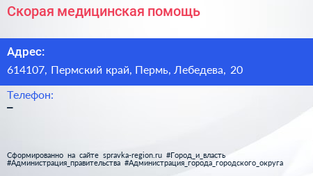 Скорая медицинская помощь по адресу 614107, Пермский край, Пермь, Лебедева, 20 в дальнейшем Организация, размещена в следующих категориях: