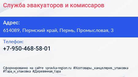Служба эвакуаторов и комиссаров по адресу 614089, Пермский край, Пермь, Промысловая, 3 в дальнейшем Организация, размещена в следующих категориях: