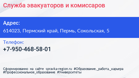 Служба эвакуаторов и комиссаров по адресу 614023, Пермский край, Пермь, Сокольская, 5 в дальнейшем Организация, размещена в следующих категориях: