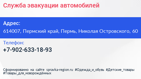 Служба эвакуации автомобилей по адресу 614007, Пермский край, Пермь, Николая Островского, 60 в дальнейшем Организация, размещена в следующих категориях: