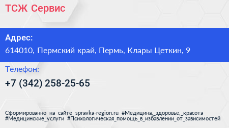 ТСЖ-Сервис по адресу 614010, Пермский край, Пермь, Клары Цеткин, 9 в дальнейшем Организация, размещена в следующих категориях: