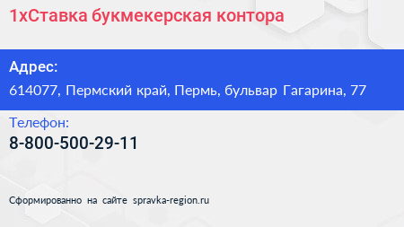 1хСтавка, букмекерская контора по адресу 614077, Пермский край, Пермь, бульвар Гагарина, 77 в дальнейшем Организация, размещена в следующих категориях: