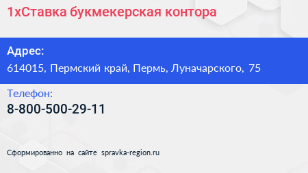 1хСтавка, букмекерская контора по адресу 614015, Пермский край, Пермь, Луначарского, 75 в дальнейшем Организация, размещена в следующих категориях: