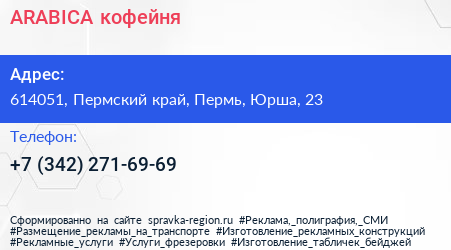 ARABICA, кофейня по адресу 614051, Пермский край, Пермь, Юрша, 23 в дальнейшем Организация, размещена в следующих категориях: