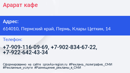 Арарат, кафе по адресу 614010, Пермский край, Пермь, Клары Цеткин, 14 в дальнейшем Организация, размещена в следующих категориях: