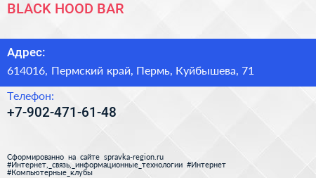 BLACK HOOD BAR по адресу 614016, Пермский край, Пермь, Куйбышева, 71 в дальнейшем Организация, размещена в следующих категориях: