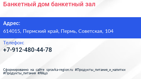 Банкетный дом, банкетный зал по адресу 614015, Пермский край, Пермь, Советская, 104 в дальнейшем Организация, размещена в следующих категориях: