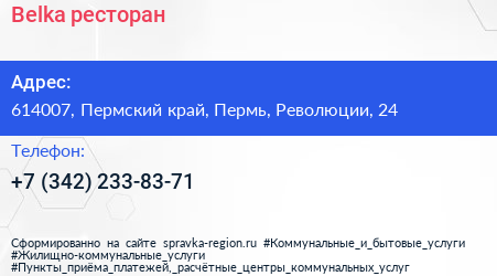 Belka, ресторан по адресу 614007, Пермский край, Пермь, Революции, 24 в дальнейшем Организация, размещена в следующих категориях: