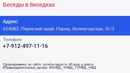 Беседы в беседках по адресу 614083, Пермский край, Пермь, Холмогорская, 2г/1 в дальнейшем Организация, размещена в следующих категориях: