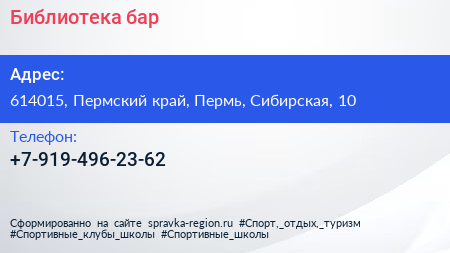 Библиотека, бар по адресу 614015, Пермский край, Пермь, Сибирская, 10 в дальнейшем Организация, размещена в следующих категориях: