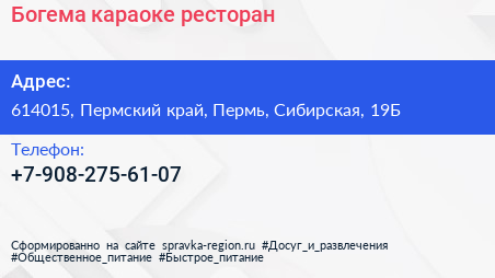Богема, караоке-ресторан по адресу 614015, Пермский край, Пермь, Сибирская, 19Б в дальнейшем Организация, размещена в следующих категориях: