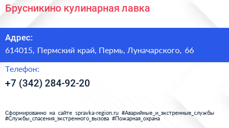 Брусникино, кулинарная лавка по адресу 614015, Пермский край, Пермь, Луначарского, 66 в дальнейшем Организация, размещена в следующих категориях: