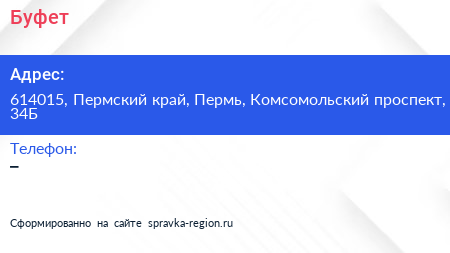 Буфет по адресу 614015, Пермский край, Пермь, Комсомольский проспект, 34Б в дальнейшем Организация, размещена в следующих категориях: