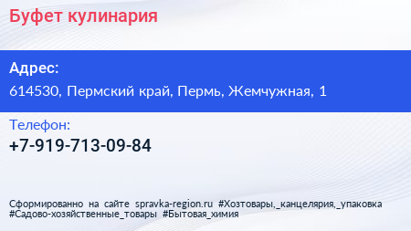 Буфет, кулинария по адресу 614530, Пермский край, Пермь, Жемчужная, 1 в дальнейшем Организация, размещена в следующих категориях: