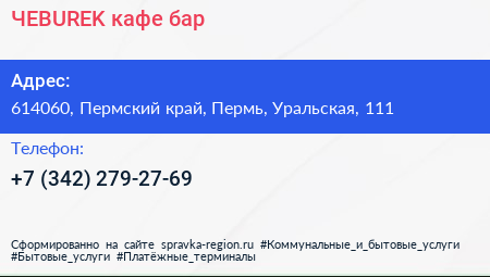 ЧEBUREK, кафе-бар по адресу 614060, Пермский край, Пермь, Уральская, 111 в дальнейшем Организация, размещена в следующих категориях: