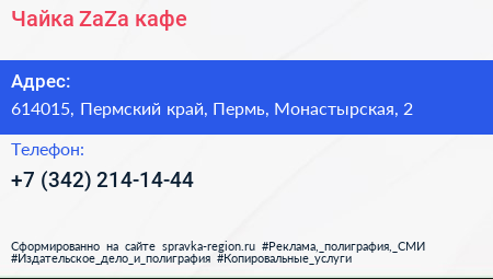 Чайка ZaZa, кафе по адресу 614015, Пермский край, Пермь, Монастырская, 2 в дальнейшем Организация, размещена в следующих категориях: