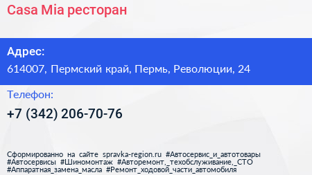 Casa Mia, ресторан по адресу 614007, Пермский край, Пермь, Революции, 24 в дальнейшем Организация, размещена в следующих категориях: