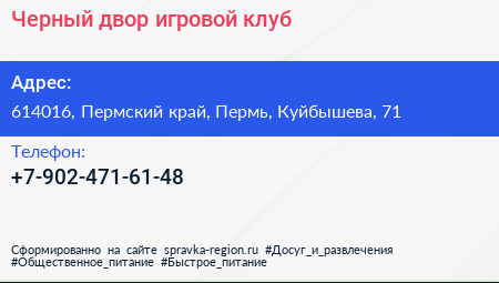 Черный двор, игровой клуб по адресу 614016, Пермский край, Пермь, Куйбышева, 71 в дальнейшем Организация, размещена в следующих категориях: