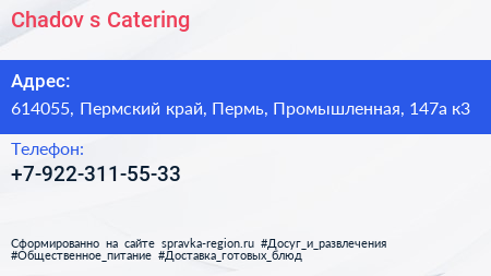 Chadov`s Catering по адресу 614055, Пермский край, Пермь, Промышленная, 147а к3 в дальнейшем Организация, размещена в следующих категориях: