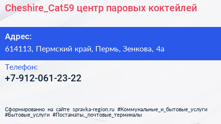 Cheshire_Cat59, центр паровых коктейлей по адресу 614113, Пермский край, Пермь, Зенкова, 4а в дальнейшем Организация, размещена в следующих категориях: