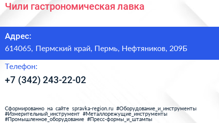 Чили, гастрономическая лавка по адресу 614065, Пермский край, Пермь, Нефтяников, 209Б в дальнейшем Организация, размещена в следующих категориях: