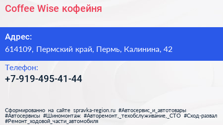 Coffee Wise, кофейня по адресу 614109, Пермский край, Пермь, Калинина, 42 в дальнейшем Организация, размещена в следующих категориях: