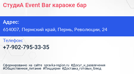 CтудиА Event Bar, караоке-бар по адресу 614007, Пермский край, Пермь, Революции, 24 в дальнейшем Организация, размещена в следующих категориях: