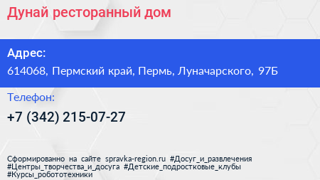 Дунай, ресторанный дом по адресу 614068, Пермский край, Пермь, Луначарского, 97Б в дальнейшем Организация, размещена в следующих категориях: