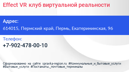 Effect VR, клуб виртуальной реальности по адресу 614015, Пермский край, Пермь, Екатерининская, 96 в дальнейшем Организация, размещена в следующих категориях: