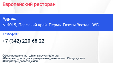 Европейский, ресторан по адресу 614015, Пермский край, Пермь, Газеты Звезда, 38Б в дальнейшем Организация, размещена в следующих категориях: