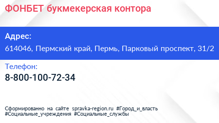 ФОНБЕТ, букмекерская контора по адресу 614046, Пермский край, Пермь, Парковый проспект, 31/2 в дальнейшем Организация, размещена в следующих категориях: