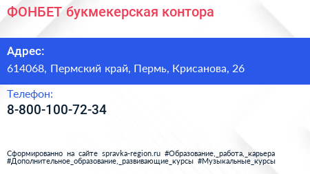 ФОНБЕТ, букмекерская контора по адресу 614068, Пермский край, Пермь, Крисанова, 26 в дальнейшем Организация, размещена в следующих категориях: