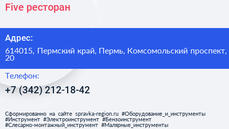 Five, ресторан по адресу 614015, Пермский край, Пермь, Комсомольский проспект, 20 в дальнейшем Организация, размещена в следующих категориях: