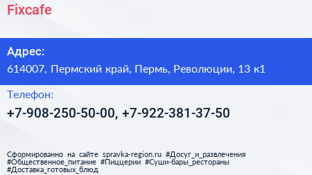 Fixcafe по адресу 614007, Пермский край, Пермь, Революции, 13 к1 в дальнейшем Организация, размещена в следующих категориях: