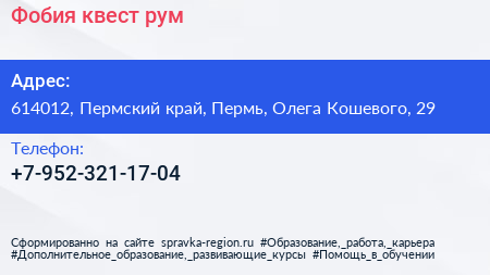 Фобия, квест-рум по адресу 614012, Пермский край, Пермь, Олега Кошевого, 29 в дальнейшем Организация, размещена в следующих категориях: