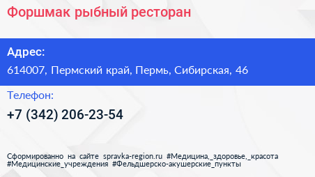 Форшмак, рыбный ресторан по адресу 614007, Пермский край, Пермь, Сибирская, 46 в дальнейшем Организация, размещена в следующих категориях:
