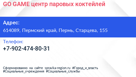 GO-GAME, центр паровых коктейлей по адресу 614089, Пермский край, Пермь, Старцева, 155 в дальнейшем Организация, размещена в следующих категориях: