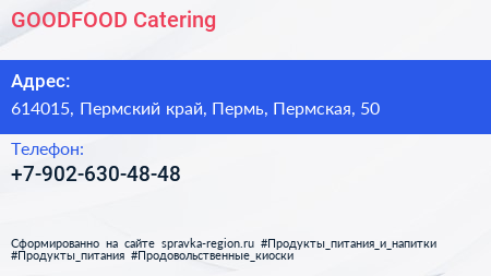 GOODFOOD Catering по адресу 614015, Пермский край, Пермь, Пермская, 50 в дальнейшем Организация, размещена в следующих категориях: